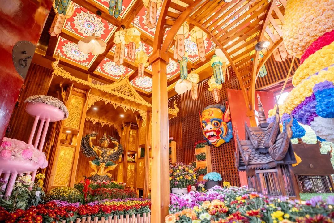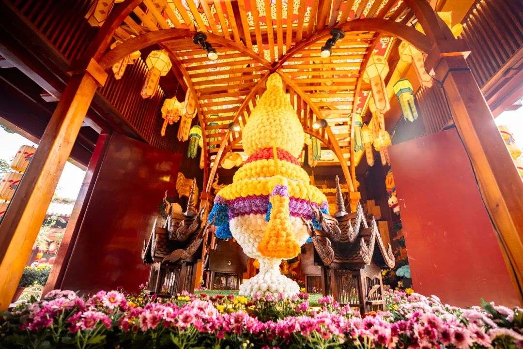 東南亞館將泰國(guó)文化與菊花巧妙結(jié)合,打造出一場(chǎng)異國(guó)風(fēng)情的菊花景點(diǎn),為游客帶來(lái)了解泰國(guó)文化和欣賞菊花美景的雙重體驗(yàn),主體部分用切花小菊扦插而成,布置各種色彩斑斕的菊花,結(jié)合泰國(guó)傳統(tǒng)花卉布置風(fēng)格,搭配泰國(guó)絲綢花布等裝飾,營(yíng)造出濃郁的泰國(guó)風(fēng)味。