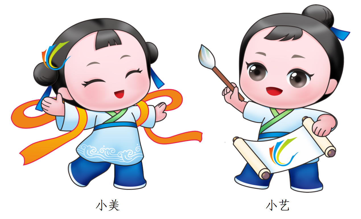 主體視覺以“創(chuàng)意與活力,藝術(shù)與青春”為設(shè)計(jì)理念,景泰藍(lán)為主色調(diào),配合多彩的美育節(jié)圖案,給人以熱烈、活潑、靈動(dòng)、藝術(shù)的視覺感受,以表達(dá)青春的活力和藝術(shù)的多樣性??ㄍㄐ蜗蠹槲锩Q為小藝和小美,以大孝子董永與七仙女為設(shè)計(jì)原型,彰顯中國(guó)孝文化之鄉(xiāng)的美名。“小美”佩戴美育節(jié)頭飾,舞帶是七仙女的織衣,象征著美育節(jié)表演項(xiàng)目的神奇創(chuàng)造力。“小藝”手握毛筆宣紙,展現(xiàn)人文特色,象征藝術(shù)作品的非凡表現(xiàn)力。