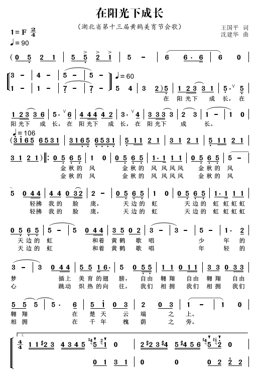 會(huì)歌《在陽(yáng)光下成長(zhǎng)》歌詞通俗、簡(jiǎn)潔明了,獨(dú)具個(gè)性的標(biāo)題“在陽(yáng)光下成長(zhǎng)”不但凸顯了湖北省黃鶴美育節(jié)活動(dòng)的核心主題,同時(shí)也形象地表現(xiàn)了在黨的陽(yáng)光照耀下少年兒童追求夢(mèng)想、崇尚藝術(shù)、快樂成長(zhǎng)的精神風(fēng)貌。