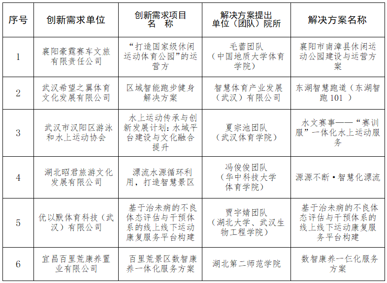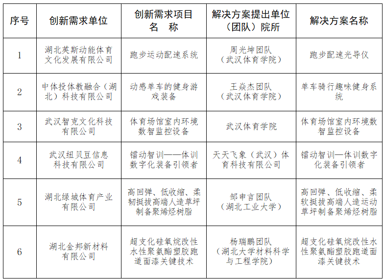 2024年6月12日,省體育局發(fā)布了《關(guān)于開展2024年湖北省體育產(chǎn)業(yè)創(chuàng)新創(chuàng)業(yè)大賽的公告》,在全省范圍內(nèi)征集體育產(chǎn)業(yè)創(chuàng)新需求和解決方案。10月29日,省體育局組織專家對參賽項(xiàng)目進(jìn)行了初賽評審,最終,推薦體育服務(wù)類、體育制造類各前六名進(jìn)入決賽路演?,F(xiàn)將進(jìn)入決賽路演的項(xiàng)目名單進(jìn)行公示,公示期3天,公示時(shí)間為10月30日至11月1日。