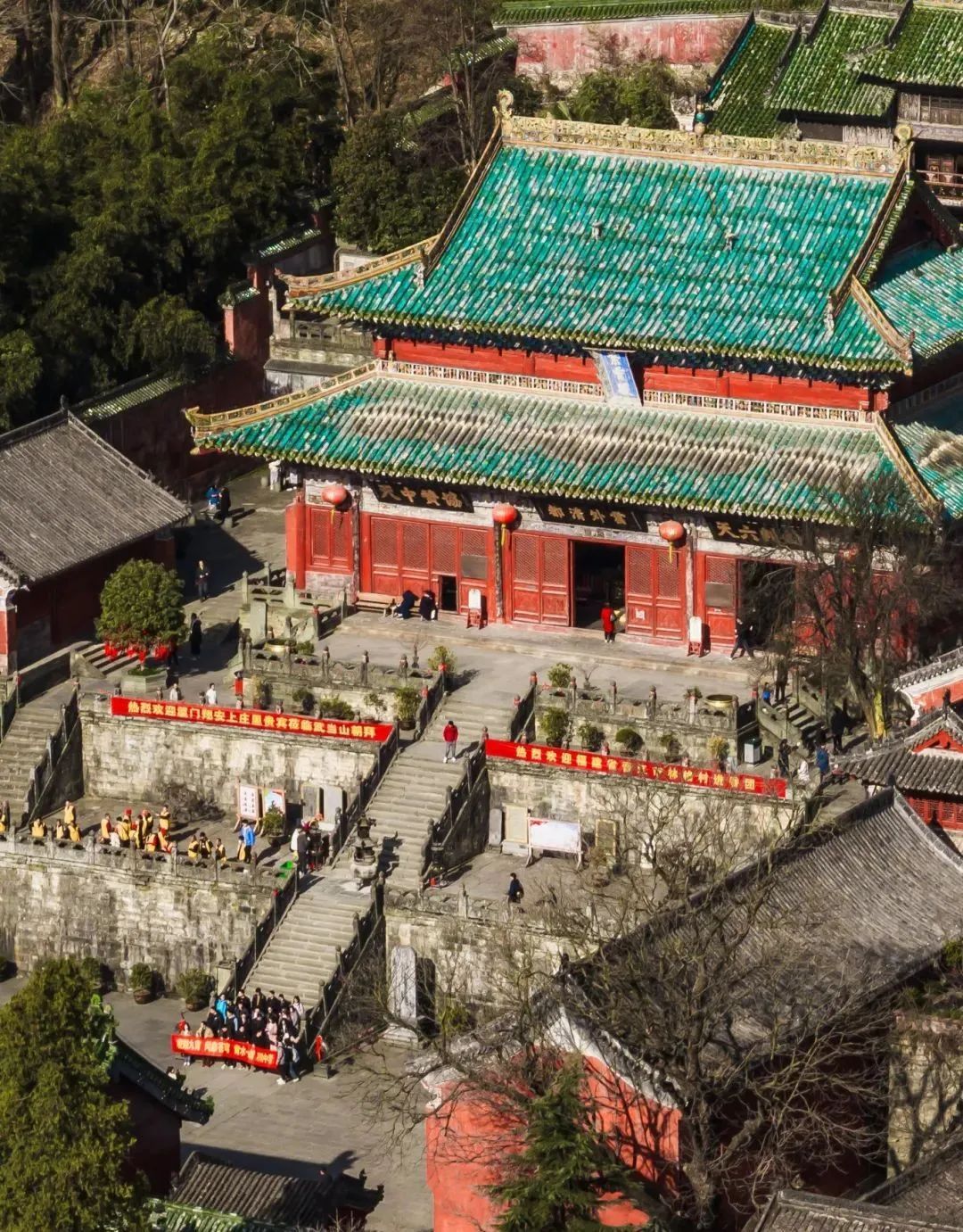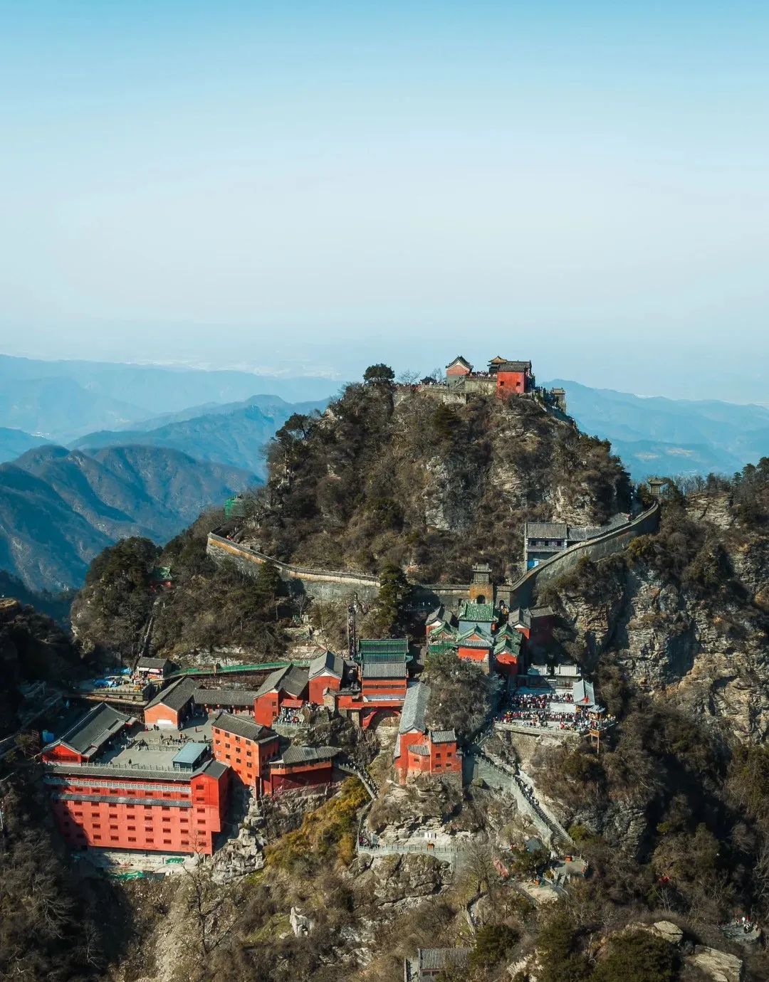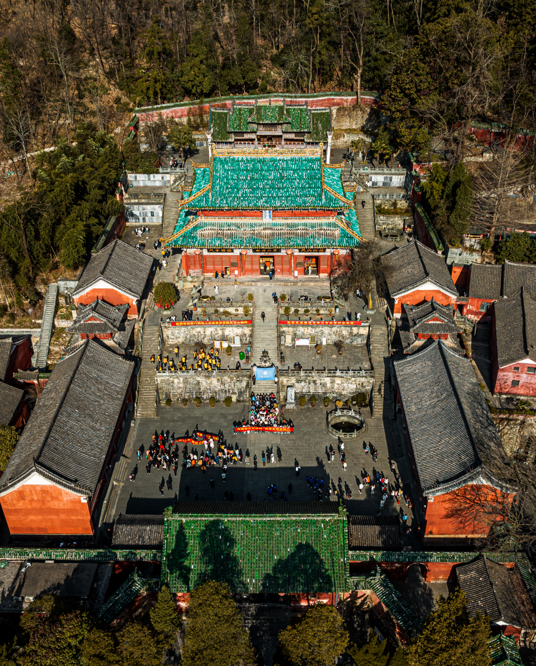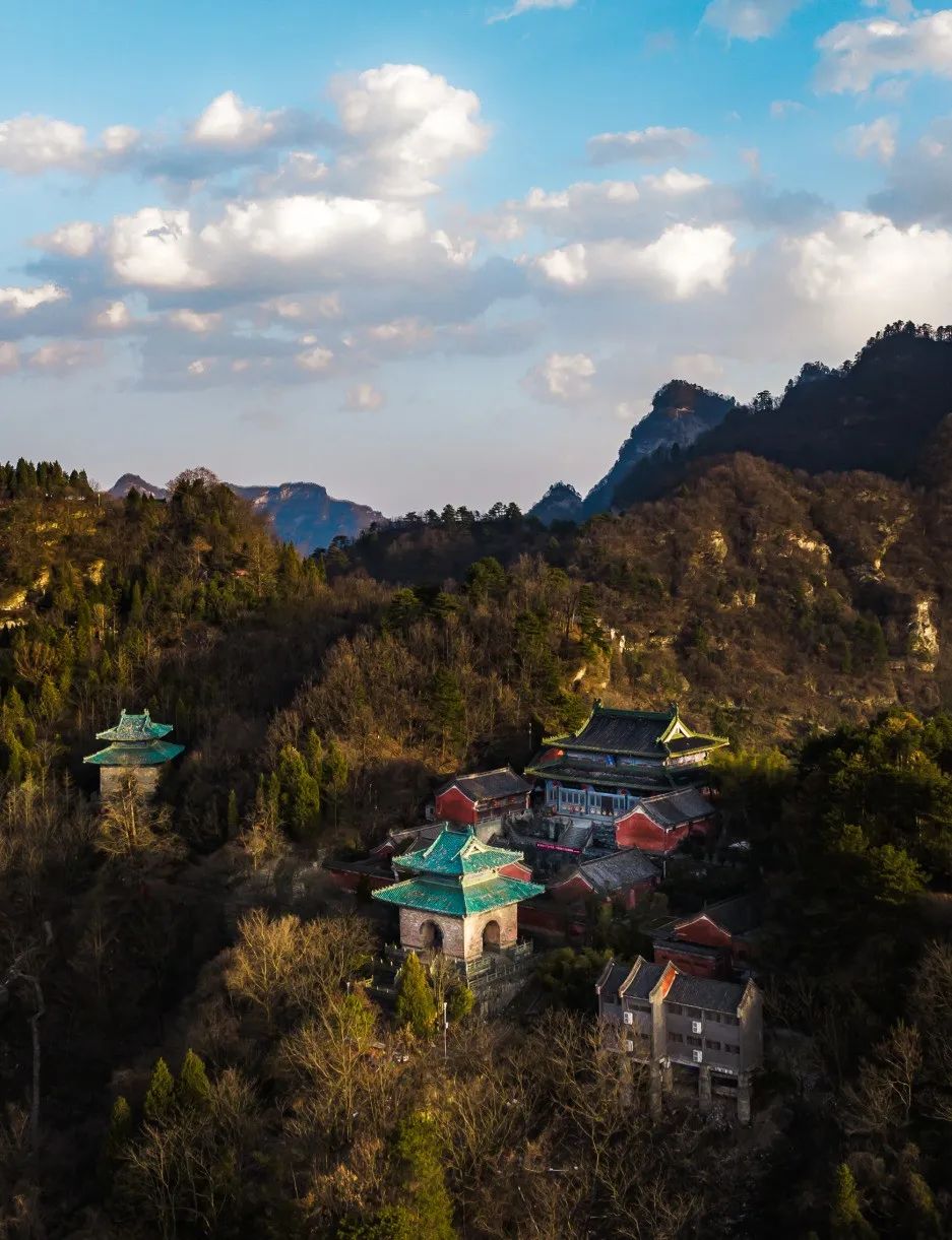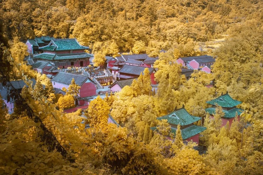 During the Ming Dynasty, in Wudang Mountain spanning an area of 800 square miles, the 33 complexes, such as 9 palaces, 8 temples, 36 monasteries, 72 rock temples, 39 bridges, and 12 pavilions, formed a magnificent landscape featuring "one monastery every five miles and one palace every ten miles, each with exquisite red walls and green tiles."