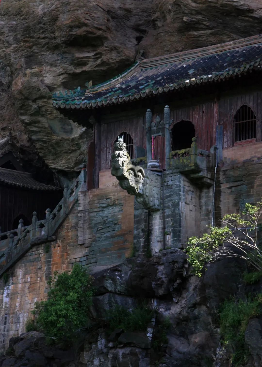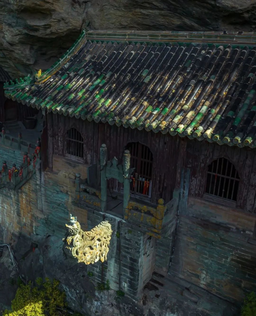 The architectural complex of the Nanyan Palace breaks away from traditional symmetrical layouts, transforming natural features such as steep peaks, caves, and cliffs into unique architectural elements. The buildings and the environment achieve a harmonious integration, where "the environment shapes the architecture, and the architecture complements the environment”, creating a dynamic spatial pattern. The roofs are adorned with black tiles trimmed with green edges, a symbol of Northern Xuanwu, a mythical creature in Chinese culture, which is a rare feature in ancient temple and royal architecture, and this is just one glimpse of the architectural splendor of the Nanyan Palace.