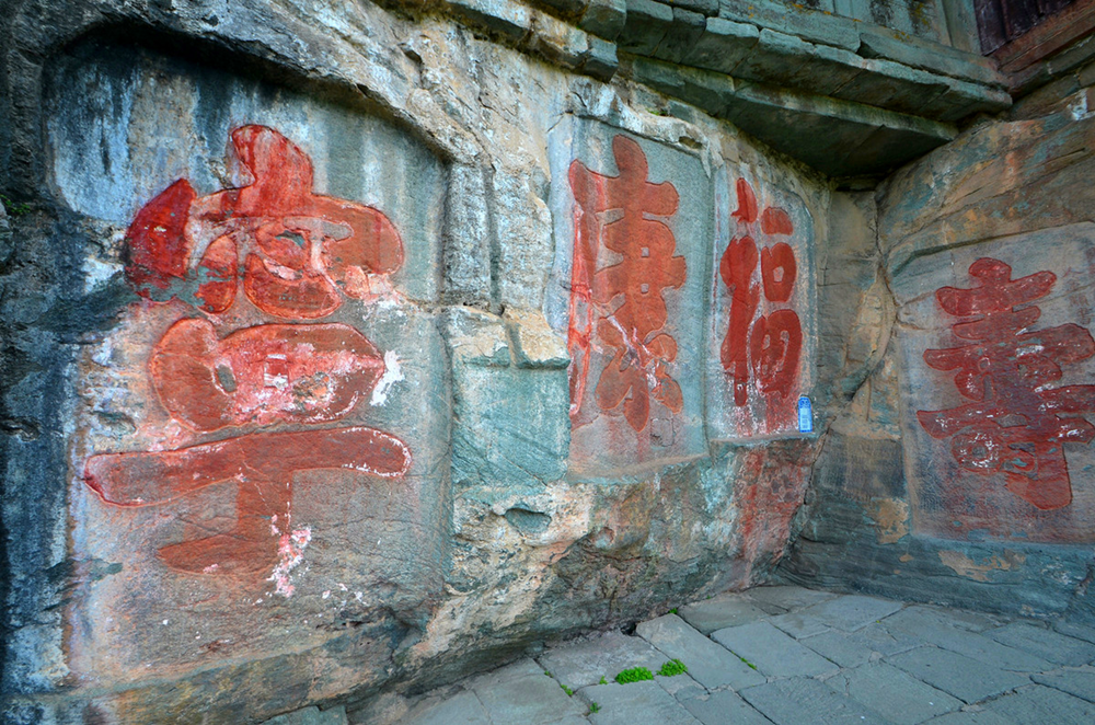 沿著大殿后神道前行,左行50米處有一座小山門,走進山門“壽??祵帯彼膫€大字躍然眼前。剛健雄渾的字體,詮釋了古人積極向上的人生觀。這四個字也開啟了武當山石刻藝術的大門。