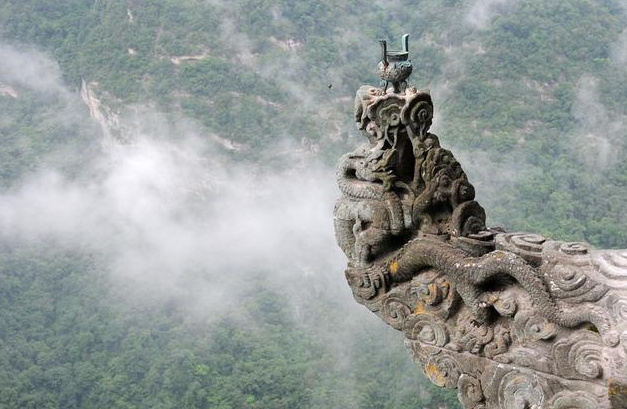 Looking up from this point, one sees towering cliffs, while looking down, breathtaking deep gorges. The stone beam extends dramatically outward. According to legend, this dragon was the mount of Emperor Zhenwu. In ancient times, devout worshippers, to demonstrate their sincerity and devotion to the deity, would risk stepping onto dragons’ backs to pray for blessings and light incense.