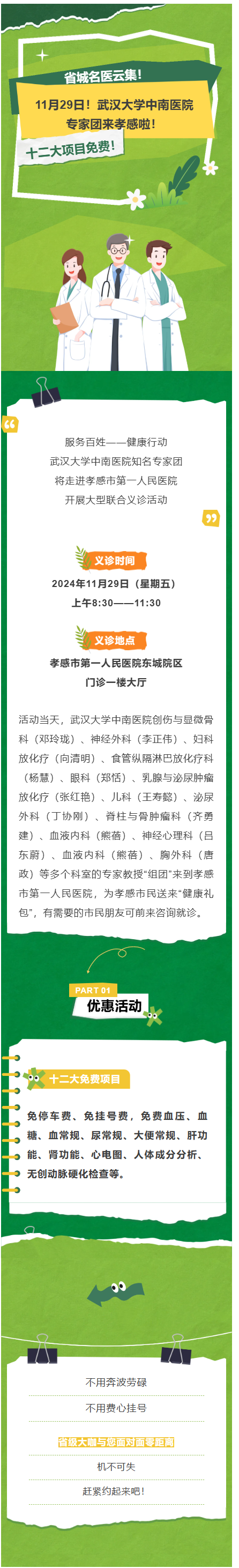 荊楚網(wǎng)(湖北日報網(wǎng))訊(記者葉修頎 通訊員李璐)11月29日,武漢大學(xué)中南醫(yī)院知名專家團(tuán)將走進(jìn)孝感市第一人民醫(yī)院開展大型聯(lián)合義診活動,多位權(quán)威專家親臨現(xiàn)場,提供專業(yè)的健康咨詢。同時,現(xiàn)場十二大項目免費,為廣大市民提供“零距離”健康服務(wù)。