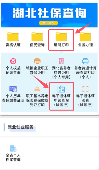 第二步:進(jìn)入“湖北12333服務(wù)大廳”后,下劃至“湖北社保查詢”,在該欄目下的【證明打印】中選擇“電子退休證申領(lǐng)查詢”,點(diǎn)擊進(jìn)入,詳見圖③。