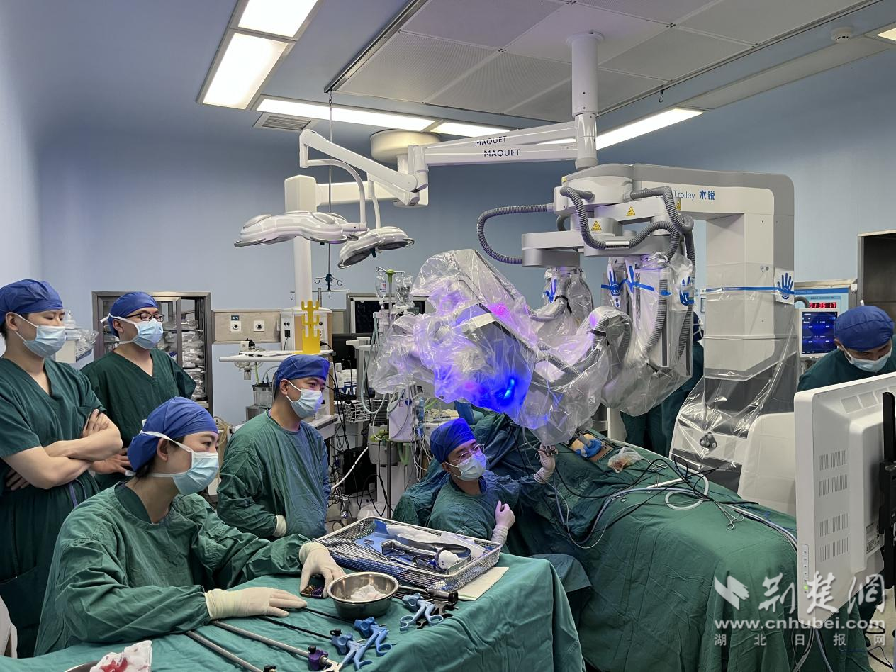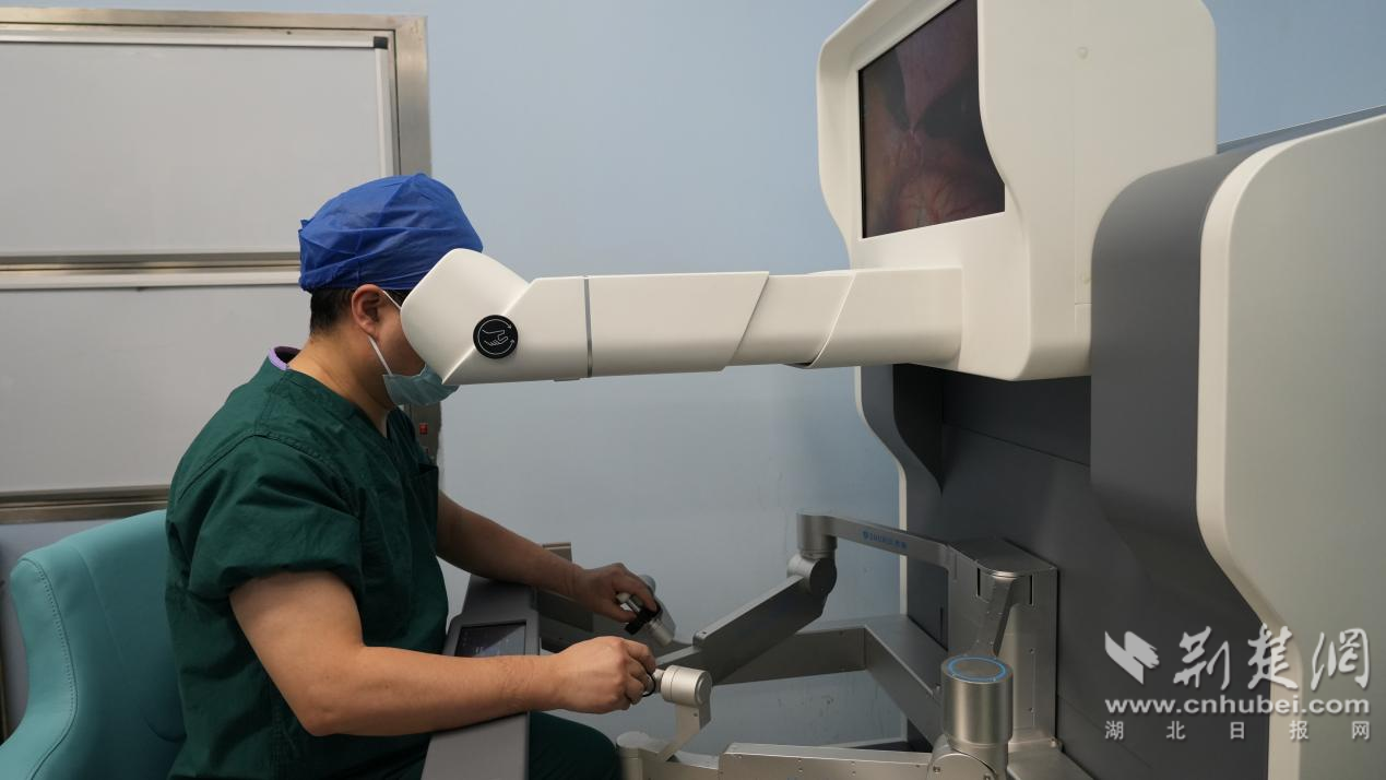 兩例手術(shù)均由孝感市中心醫(yī)院泌尿外科主任魏卓主刀,他在操控臺(tái)前通過(guò)觀看3D高清放大的視圖,眼看、手動(dòng)、腳踩,發(fā)出一系列指令,精確地操縱著伸入患者體內(nèi)的四支蛇形機(jī)械臂,完成了一系列精細(xì)的操作,包括前進(jìn)、后退、分離和電凝等動(dòng)作。主治醫(yī)師范哲奇、住院醫(yī)師肖邦則在手術(shù)臺(tái)上根據(jù)手術(shù)需要適時(shí)更換器械。