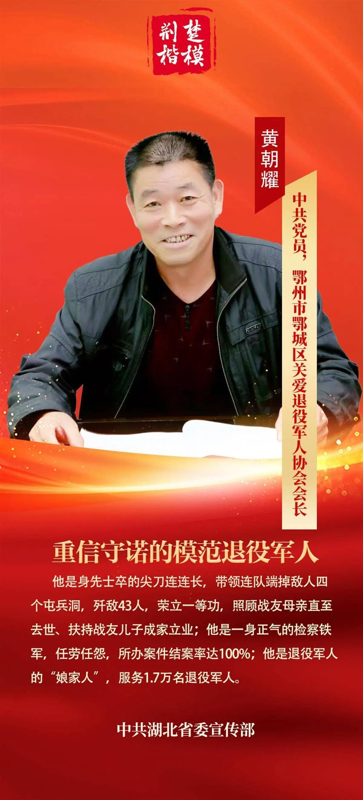 “荊楚楷?!标P(guān)于黃朝耀的頒獎詞為:他是身先士卒的尖刀連連長,帶領(lǐng)連隊端掉敵人四個屯兵洞,殲敵43人,榮立一等功,照顧戰(zhàn)友母親直至去世、扶持戰(zhàn)友兒子成家立業(yè);他是一身正氣的檢察鐵軍,任勞任怨,所辦案件結(jié)案率達(dá)100%;他是退役軍人的“娘家人”,服務(wù)1.7萬名退役軍人。2024年,他榮獲“全國模范退役軍人”榮譽(yù)稱號。