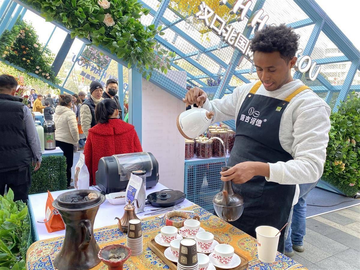 在武商夢時代“國潮好物市集”,埃塞俄比亞小伙貝卡·麥勒斯(Beka Melese)正在手沖咖啡招待顧客。(記者劉天縱攝)
