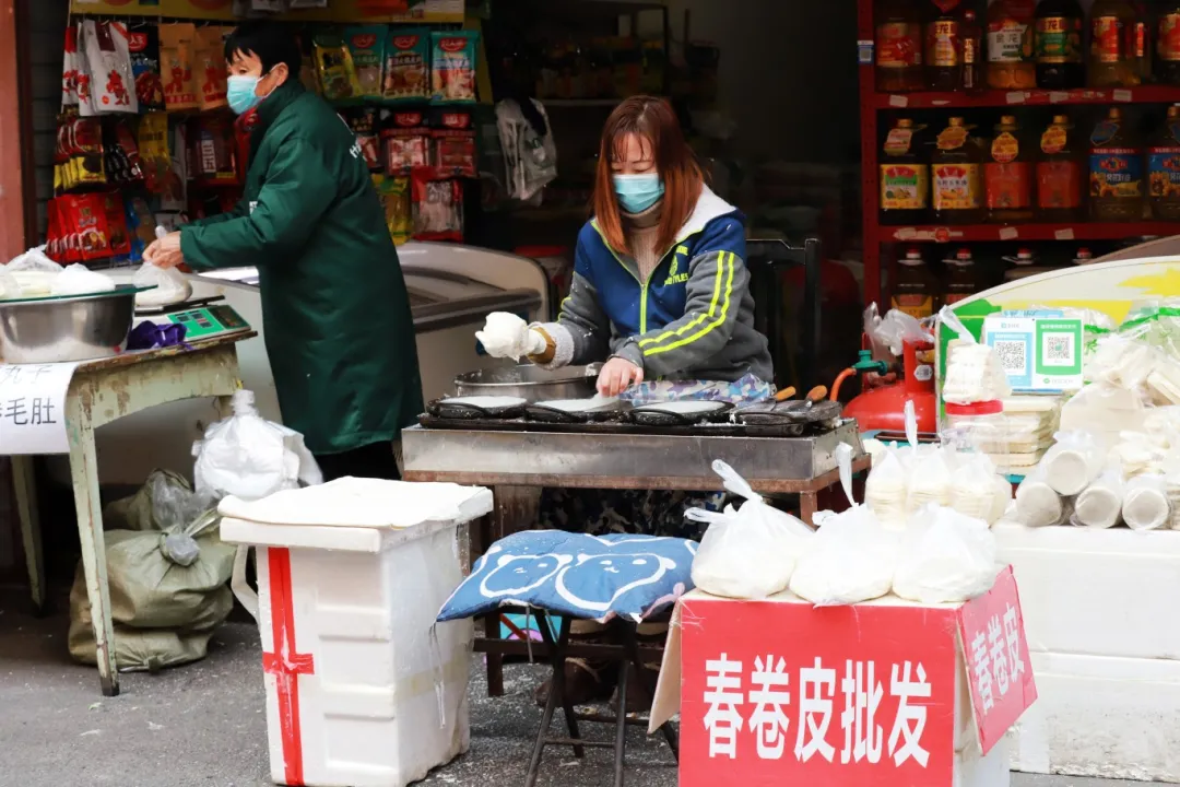 俗話說:“民以食為天”,而那些地地道道的美食就藏在深街小巷,穿梭在老街的農(nóng)貿(mào)市場(chǎng)里,熙熙攘攘的人群中,吆喝聲、討價(jià)還價(jià)聲、手機(jī)付款聲此起彼伏。放眼望去,有一家豎著春卷皮批發(fā)招牌的小店門口排起了長(zhǎng)隊(duì),店老板夏女士說:“春卷皮吃法簡(jiǎn)單方便,一年四季都很受孝感人青睞,現(xiàn)在臨近春節(jié),來買春卷皮的人特別多,每天能銷幾千張?!?/p>