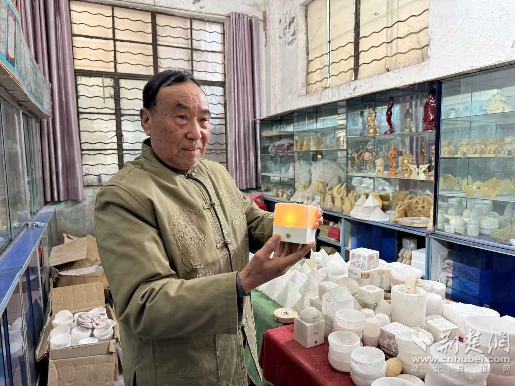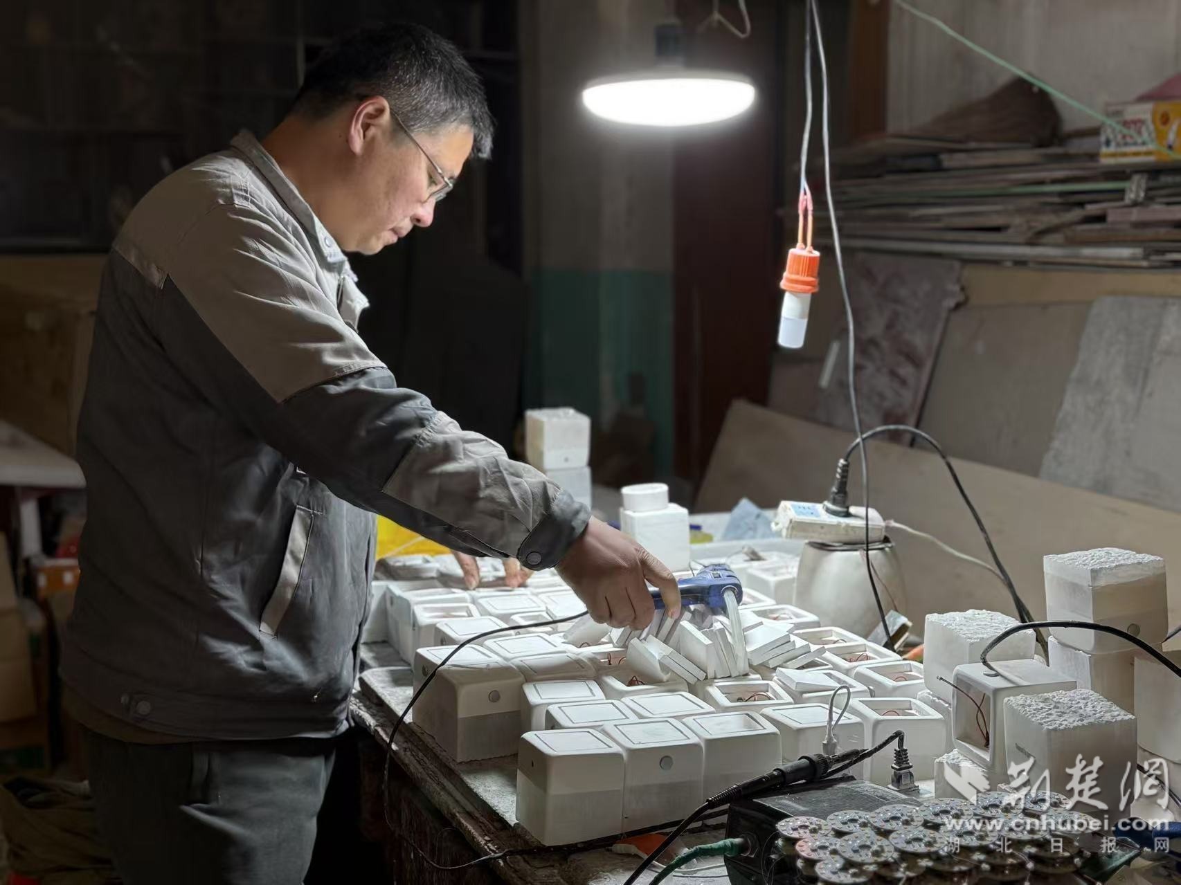 上世紀90年代,由于改革開放政策,應(yīng)城石膏銷路驟然寬廣,相關(guān)工藝產(chǎn)業(yè)迅速發(fā)展起來。應(yīng)城市工藝膏雕廠成立,伍佰林被任命為廠長?!白铋_始是做石膏枕頭,市場需求很大,后來慢慢做文房四寶、工藝擺件、浮雕壁畫這些類型?!蔽榘亓纸榻B,隨著科技進步和市場需求變化,膏雕工藝品也在不斷創(chuàng)新,融入一些聲光電技術(shù),比如石膏香氛、石膏臺燈等等產(chǎn)品,受到很多年輕人的喜愛。