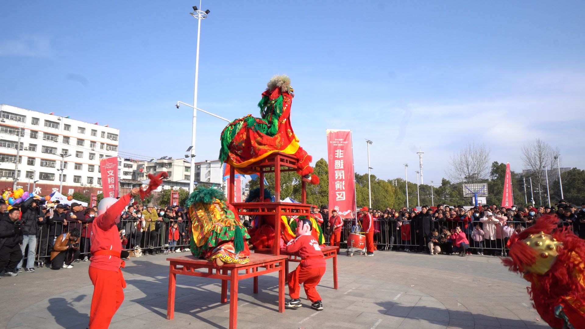 非遺市集活動(dòng)分為民俗非遺展示、非遺展演、互動(dòng)體驗(yàn)、文創(chuàng)產(chǎn)品展示、美食市集5大區(qū)域。展演區(qū)人氣火爆,宣化店鎮(zhèn)李樓舞獅隊(duì)表演“四獅獻(xiàn)瑞鬧元宵”,獅子們以其靈動(dòng)舞姿和默契配合,展現(xiàn)了全縣人民高揚(yáng)“進(jìn)”的主旋律、奮勇爭先的精神風(fēng)貌。