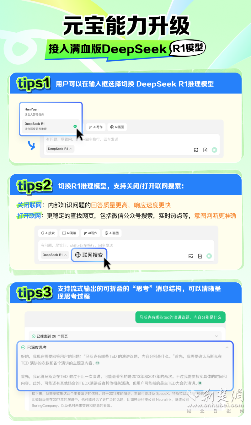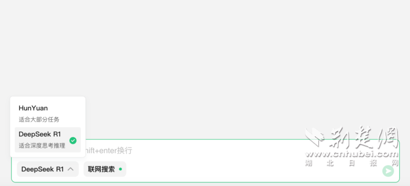 荊楚網(wǎng)(湖北日?qǐng)?bào)網(wǎng))訊(通訊員 袁軒)2月13日,騰訊AI助手“騰訊元寶”迎來(lái)重大更新,同時(shí)支持混元和DeepSeek兩大模型,打開騰訊元寶并進(jìn)入對(duì)話界面,即可免費(fèi)使用DeepSeek-R1滿血版模型。