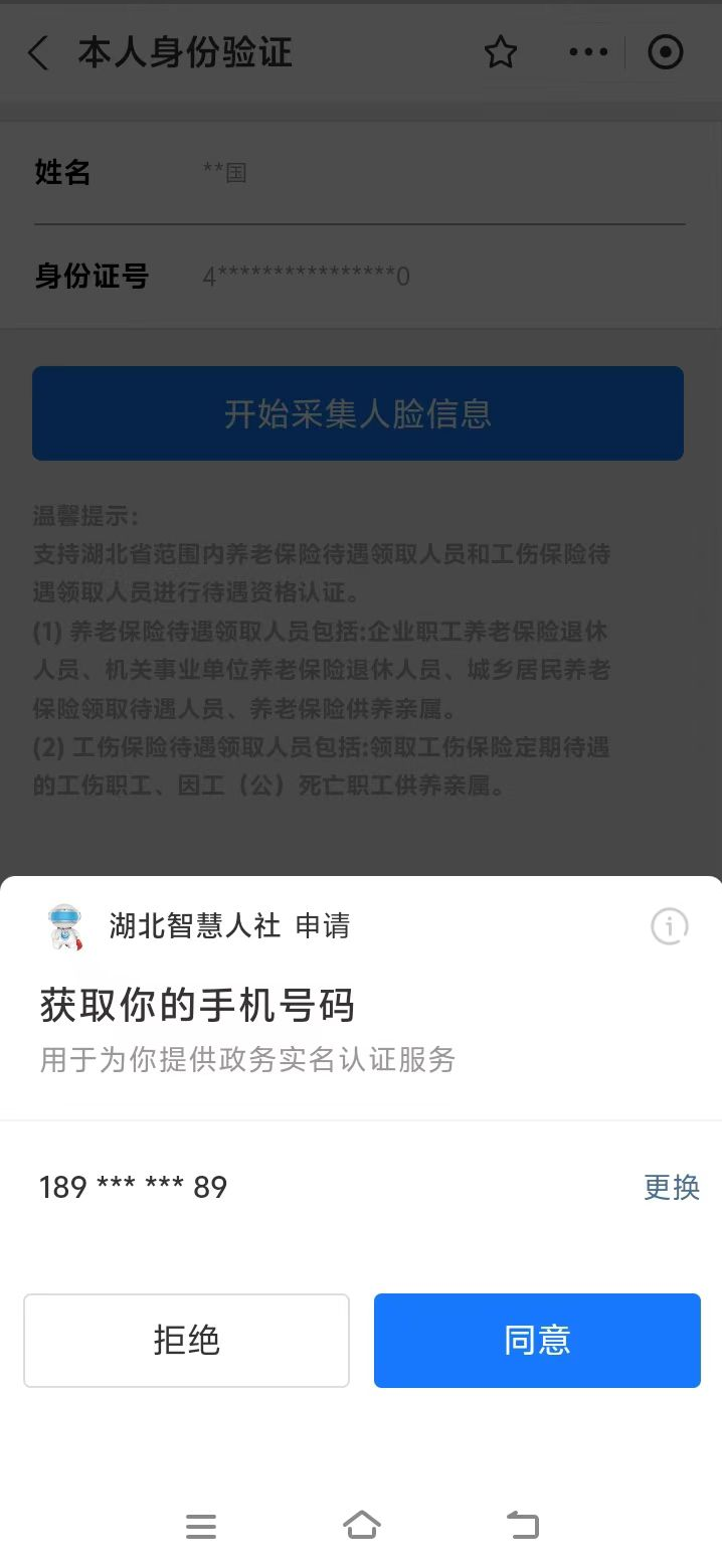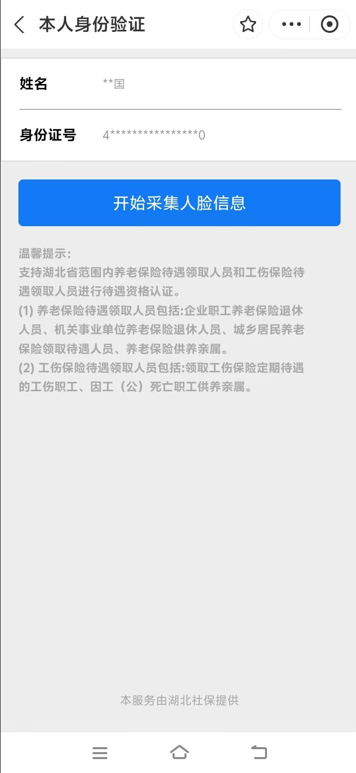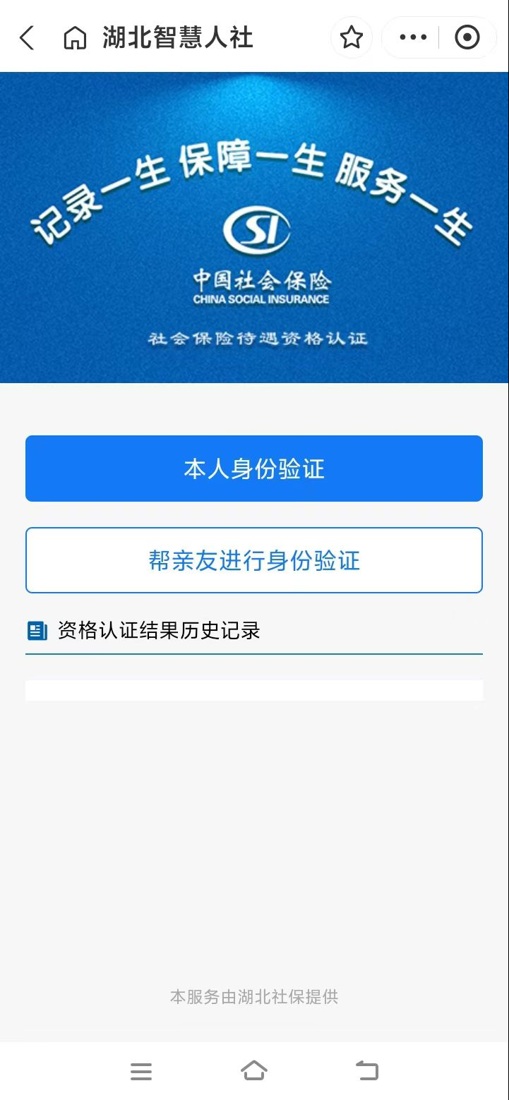 1.掃描上方二維碼后,跳轉(zhuǎn)進入湖北省智慧人社界面,點擊“本人身份驗證”或者“幫親友進行身份驗證”,填入“姓名”、“身份證號”,點擊“開始采集人臉信息”即可開始資格認證。