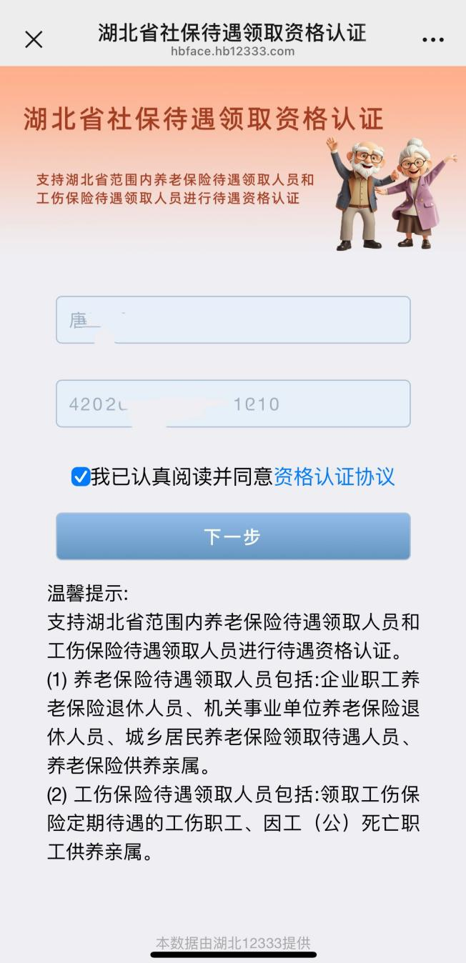 1.掃描上方二維碼后,跳轉(zhuǎn)進入湖北省社保待遇領(lǐng)取認證界面填入“姓名”、“身份證號”,點擊“下一步”即可開始資格認證。
