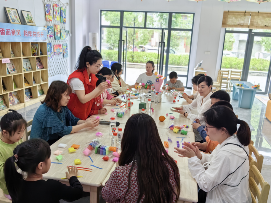 赤壁市羊樓洞村,愛(ài)心媽媽正在帶領(lǐng)孩子們做手工?!?/p>