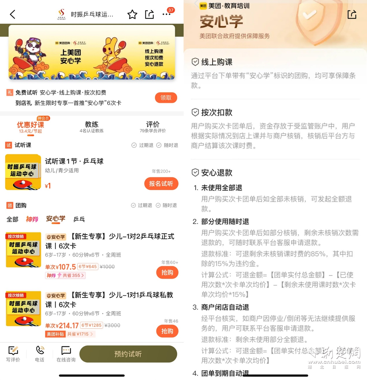 據(jù)了解,“安心學(xué)”是美團(tuán)聯(lián)合各地政府部門,面向教育培訓(xùn)領(lǐng)域創(chuàng)新推出的履約交易保障新模式,主要依托平臺的多次卡團(tuán)購產(chǎn)品,在運(yùn)動培訓(xùn)、書法、科學(xué)探索、棋藝、美術(shù)、國學(xué)、音樂等非學(xué)科類培訓(xùn)品類推出按次扣費的短期課,給消費者提供靈活、可靠的消費保障。