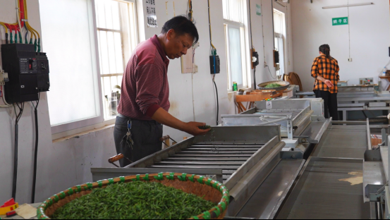 山上采茶忙碌,山下制茶飄香。在合作社的茶加工車間內(nèi),茶香四溢,一片熱火朝天。經(jīng)過(guò)攤青、揉捻、烘干等多道工序,一片片鮮葉搖身一變,成了色澤翠綠、香氣清幽的上好春茶。