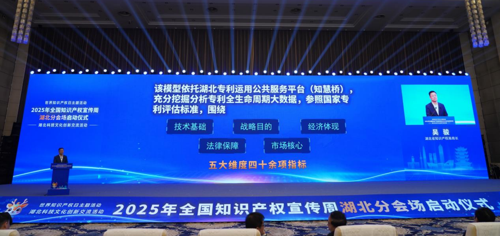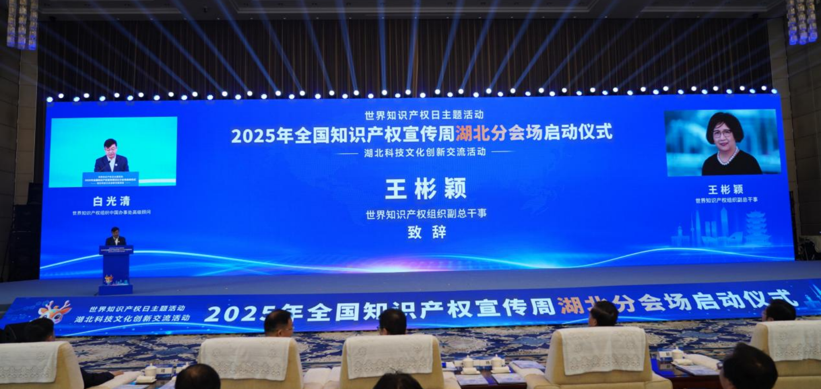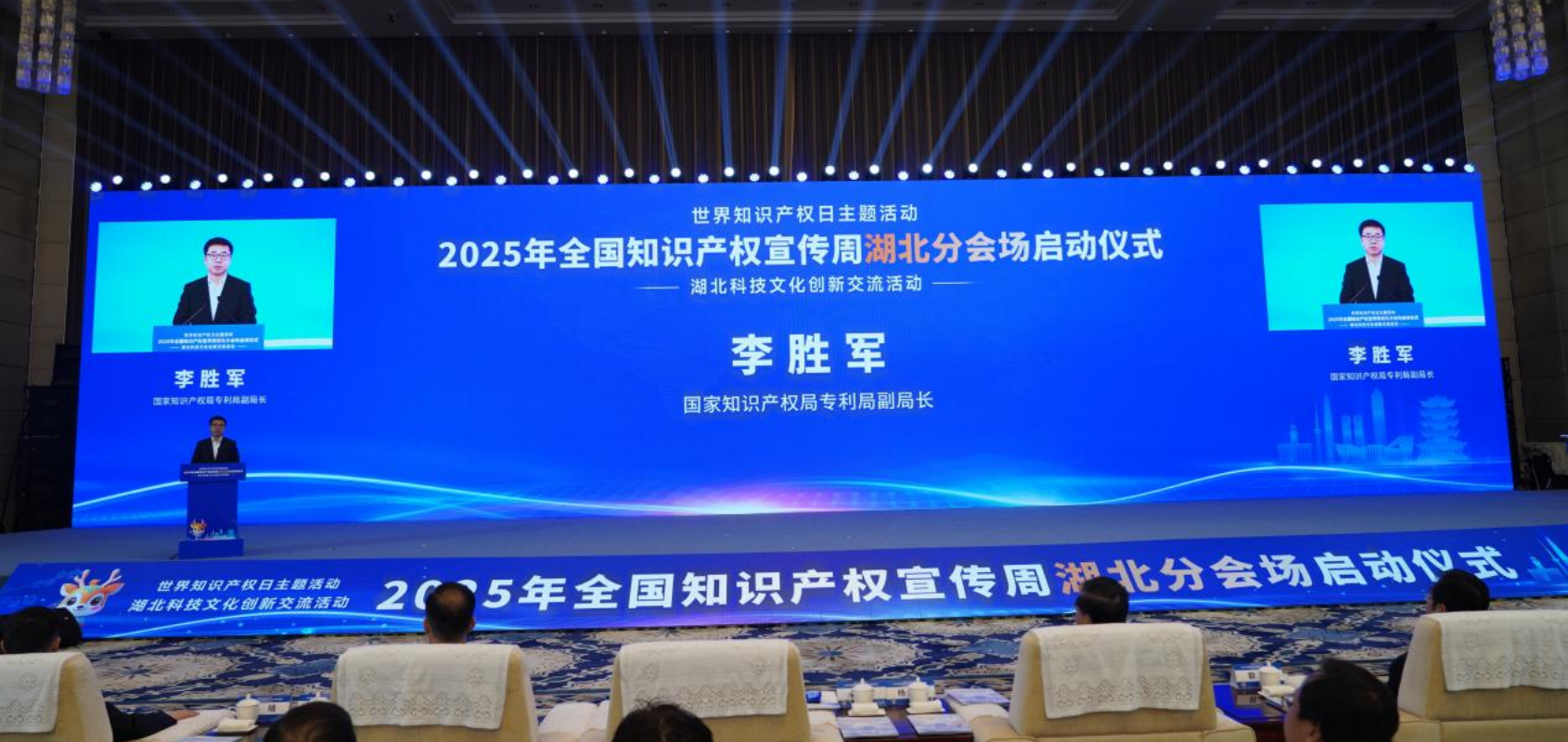 活動現(xiàn)場,世界知識產(chǎn)權(quán)組織副總干事王彬穎發(fā)來書面致辭,國家知識產(chǎn)權(quán)局專利局副局長李勝軍現(xiàn)場致辭,湖北省人大常委會副主任楊云彥出席并啟動湖北分會場,湖北省人民政府副秘書長郭宇、世界知識產(chǎn)權(quán)組織中國辦事處高級顧問白光清、湖北省知識產(chǎn)權(quán)局局長吳駿出席活動。來自專利審查協(xié)作湖北中心,省知識產(chǎn)權(quán)戰(zhàn)略實(shí)施工作聯(lián)席會議成員單位,國家知識產(chǎn)權(quán)強(qiáng)國建設(shè)試點(diǎn)示范城市、縣域政府及園區(qū)管委會,全省各市州知識產(chǎn)權(quán)局,省內(nèi)高校院所、企事業(yè)單位代表等500余人齊聚一堂。