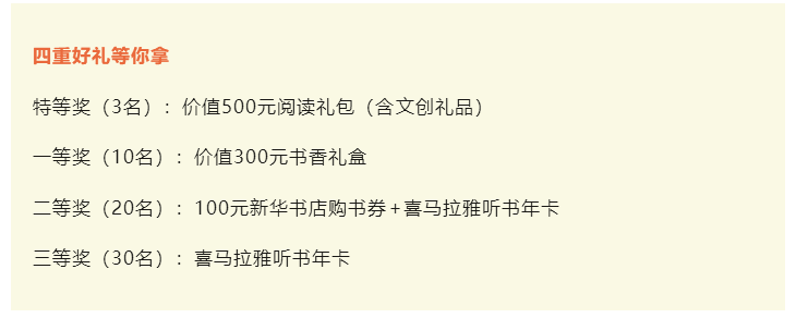 優(yōu)秀作品將獲新華書店購書券、喜馬拉雅聽書年卡、智能地球儀等獎(jiǎng)勵(lì),并在官方平臺展播!