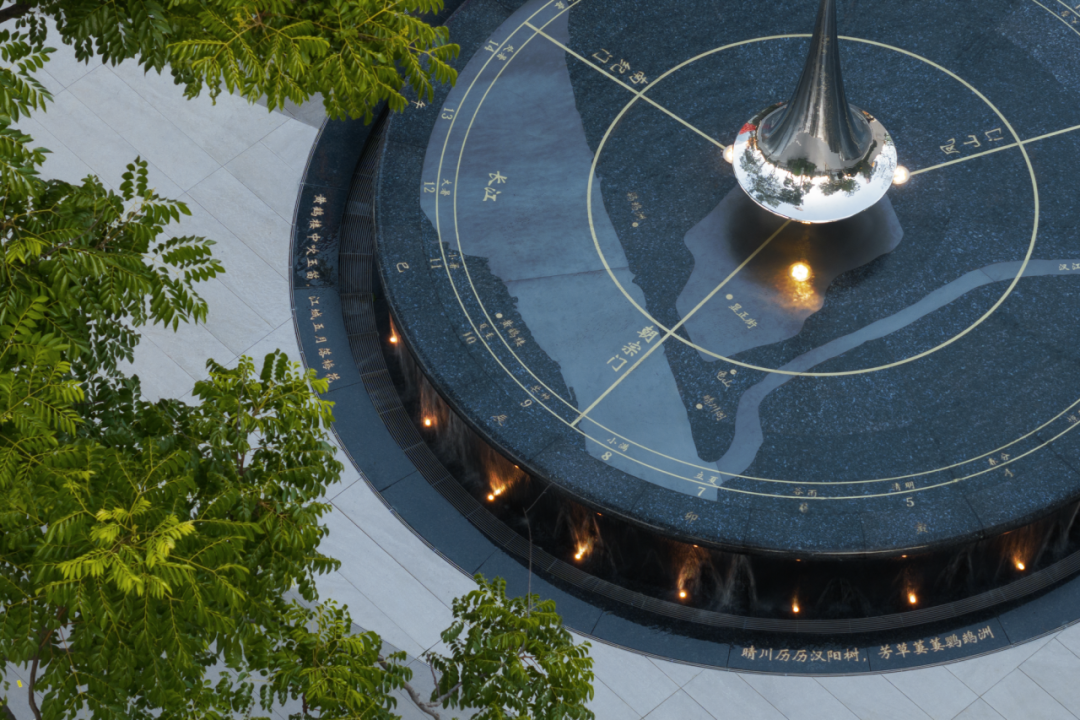 △「武漢之眼」入口廣場中心,擺放有精致的日晷藝術(shù)裝置。走進(jìn)入口廣場中心,其精致的日晷藝術(shù)裝置與水景巧妙結(jié)合成為視覺焦點,可以從這些藝術(shù)裝置窺見漢陽的文化歷史。尤其是夜晚,水景被柔和的燈光照亮,如同夜空中最亮的星,為廣場增添了幾分夢幻與浪漫。