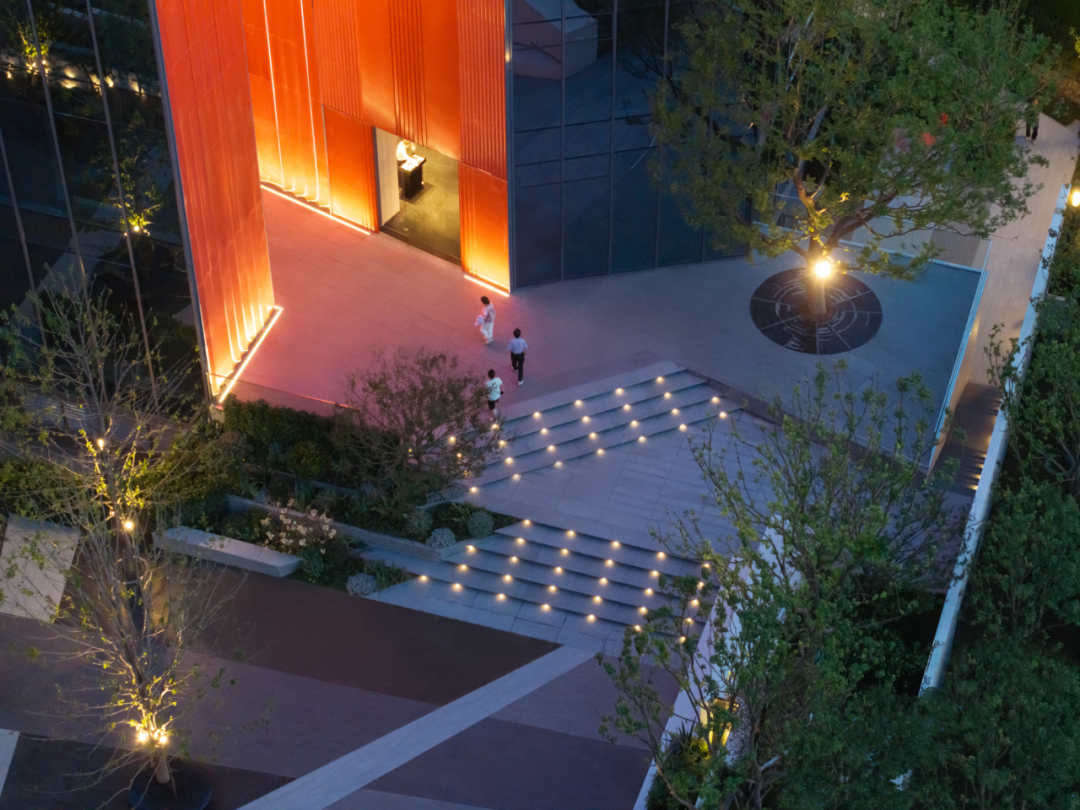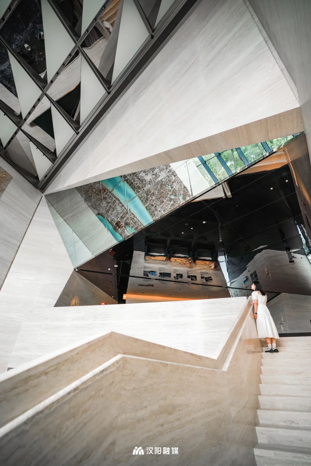 △「武漢之眼」中間鏤空形成一個紅色取景框。站在「武漢之眼」正前方,你會被其宛如水晶切割的建筑體深深震撼,中間斜向構(gòu)造,形成一個巨大的紅色取景框,在光的引導(dǎo)下,視線聚焦,隨手拍都是大片。