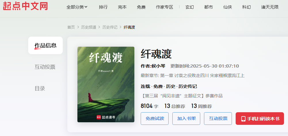 5月30日凌晨,巴東籍學(xué)者、武漢體育學(xué)院新聞傳播學(xué)院副教授侯小琴的長(zhǎng)篇?dú)v史小說《纖魂渡》在起點(diǎn)中文網(wǎng)正式上線。該作品以民國(guó)時(shí)期巴東傳奇人物宋三姐為主線,生動(dòng)刻畫了長(zhǎng)江上游民眾搏浪斗匪、抗日救亡的壯闊歷史,填補(bǔ)了川江流域民國(guó)敘事的文學(xué)空白。