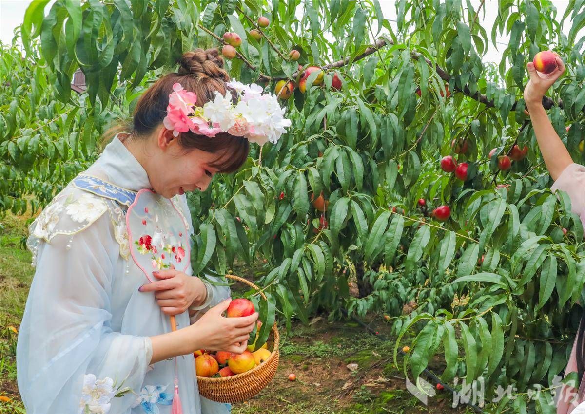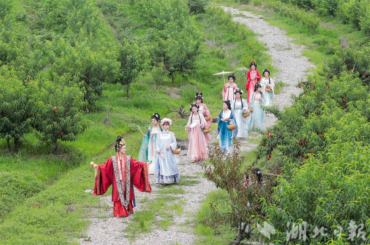 6月10日,穿著漢服的演員在采摘蜜桃。(湖北日報(bào)通訊員 陳超 攝)
