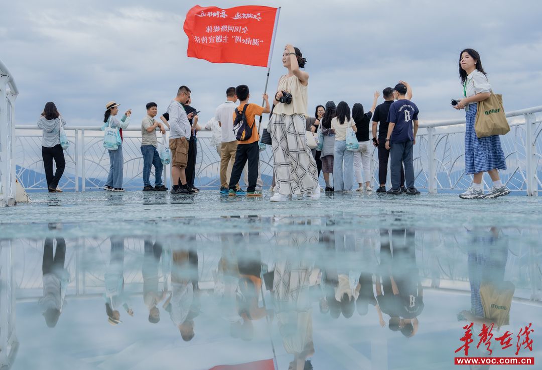世界最大“三葉草”玻璃高空觀景平臺“懸崖天眼”傲立牛頭頂,它懸挑58.5米、寬79.3米、高320米,擁有415平方米的載員面積,外形似明珠耀于峰巔。登上觀景臺,眼前是云霧騰繞的天空,向下可俯瞰國內(nèi)首屈一指的白玉丹霞地貌群落,氣勢磅礴、壯觀無比。采訪團(tuán)記者們踏上這絕壁之上的天眼,迎著山風(fēng),對著無人機(jī)揮手吶喊,歡聲笑語與壯麗景色交融,繪就絕美畫卷。