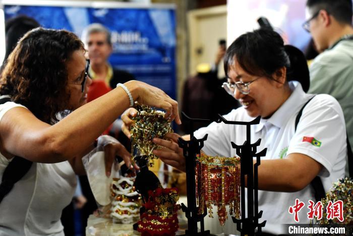 當?shù)貢r間6月27日,文明對話系列活動(金磚專場)在巴西里約熱內盧舉行。一位巴西觀眾在“歡朋滿粵”嶺南文化創(chuàng)新展上了解國潮鳳冠。中新社記者 林春茵 攝