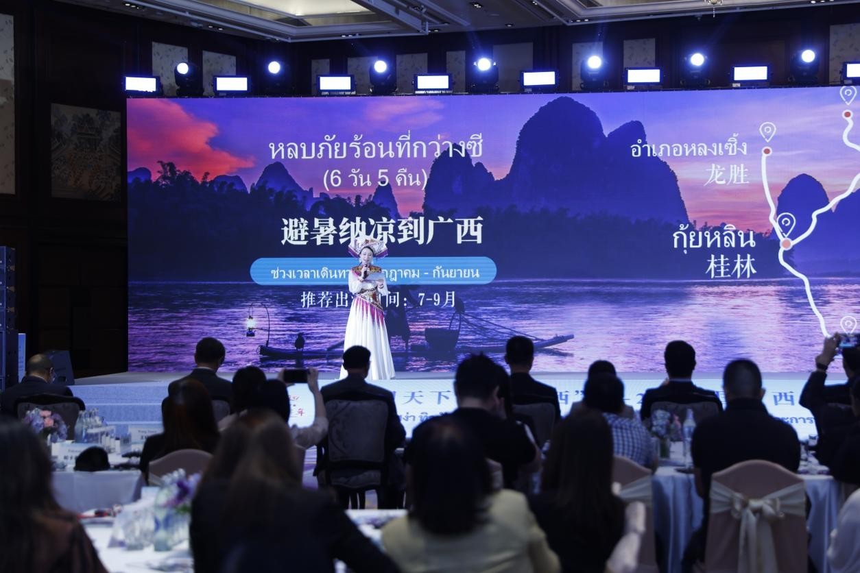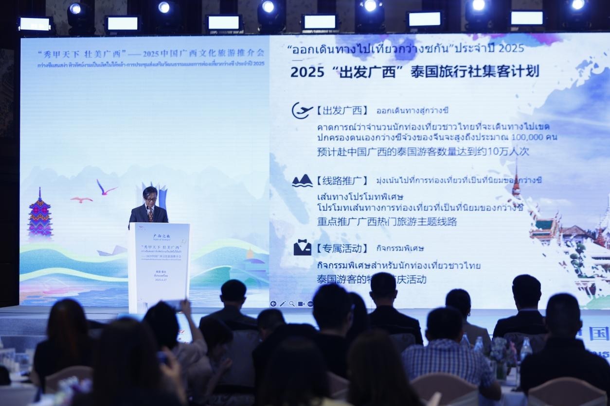 賈卡蓬·當(dāng)素提坦在致辭中表示,今年是泰中建交50周年暨“泰中友誼金色50年”,兩國(guó)關(guān)系邁入歷史新高度。在這一重要節(jié)點(diǎn)上,廣西作為中國(guó)—東盟合作前沿和文旅資源富集之地,舉辦本次旅游推介活動(dòng),不僅為泰國(guó)民眾打開了了解廣西文化與自然的窗口,也為泰國(guó)旅游業(yè)界提供了更多合作的可能。泰方愿同廣西一道,通過媒體聯(lián)動(dòng)、渠道合作、內(nèi)容共創(chuàng)等方式,共同擴(kuò)大雙方旅游品牌在區(qū)域和國(guó)際市場(chǎng)的影響力,實(shí)現(xiàn)客源互引、互利共贏的良好局面。