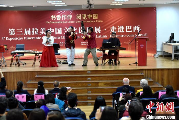 當(dāng)?shù)貢r(shí)間6月28日,巴西圣保羅,中國(guó)傳統(tǒng)音樂(lè)樂(lè)團(tuán)百花樂(lè)團(tuán)在第三屆拉美中國(guó)文化巡回展上演奏國(guó)樂(lè)。中新社記者 林春茵 攝