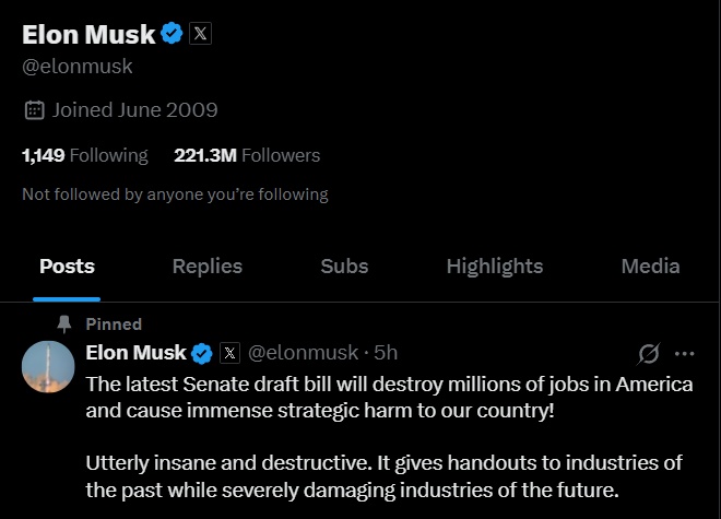 當(dāng)?shù)貢r(shí)間6月28日,美國(guó)企業(yè)家埃隆·馬斯克在社交媒體平臺(tái)上發(fā)文表示,美國(guó)參議院關(guān)于大規(guī)模稅收與支出法案的最新草案“將摧毀美國(guó)數(shù)百萬(wàn)個(gè)就業(yè)崗位,并對(duì)美國(guó)造成巨大的戰(zhàn)略傷害”。馬斯克還說(shuō):“這項(xiàng)法案將債務(wù)上限提高5萬(wàn)億美元,這是歷史上最大的增幅,讓美國(guó)走上被債務(wù)奴役的快車道。”