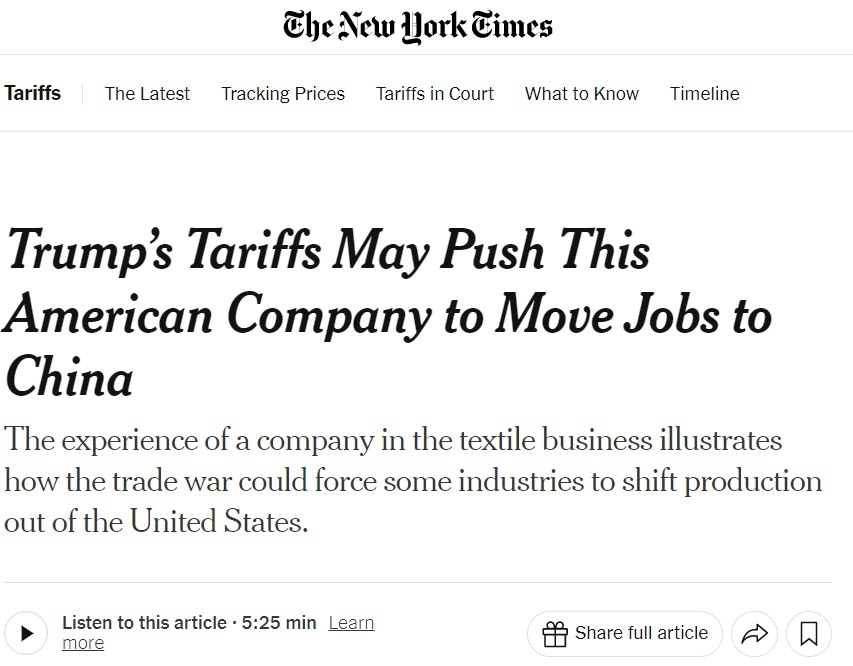 文章說,特朗普政府發(fā)起的全球貿(mào)易戰(zhàn)動搖了Cocona Labs公司的經(jīng)濟(jì)基礎(chǔ)。受到美國關(guān)稅不確定性的影響,加之中國實(shí)施的對等反制措施,這家美國公司將開始做出改變:將其核心產(chǎn)品的部分生產(chǎn)從美國轉(zhuǎn)移到中國的工廠生產(chǎn)。