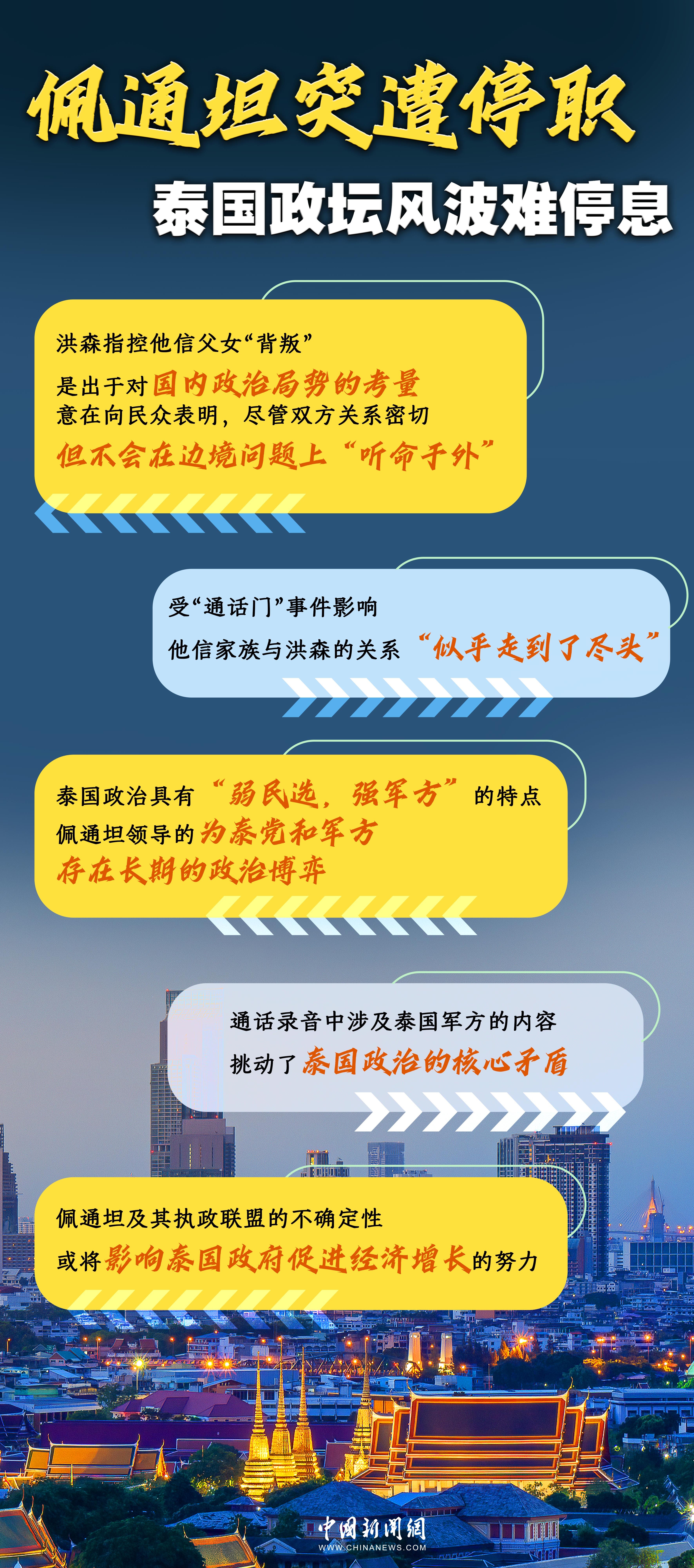 中新網(wǎng)7月2日電 當(dāng)?shù)貢r間7月1日,上任不到一年的泰國總理佩通坦突遭停職。佩通坦近日深陷通話錄音風(fēng)波,被反對者要求下臺。與柬埔寨參議院主席、前首相洪森的通話究竟聊了什么?為何能引起如此大的風(fēng)波?泰國政壇掀起的這場風(fēng)暴,何時才可能停息?
