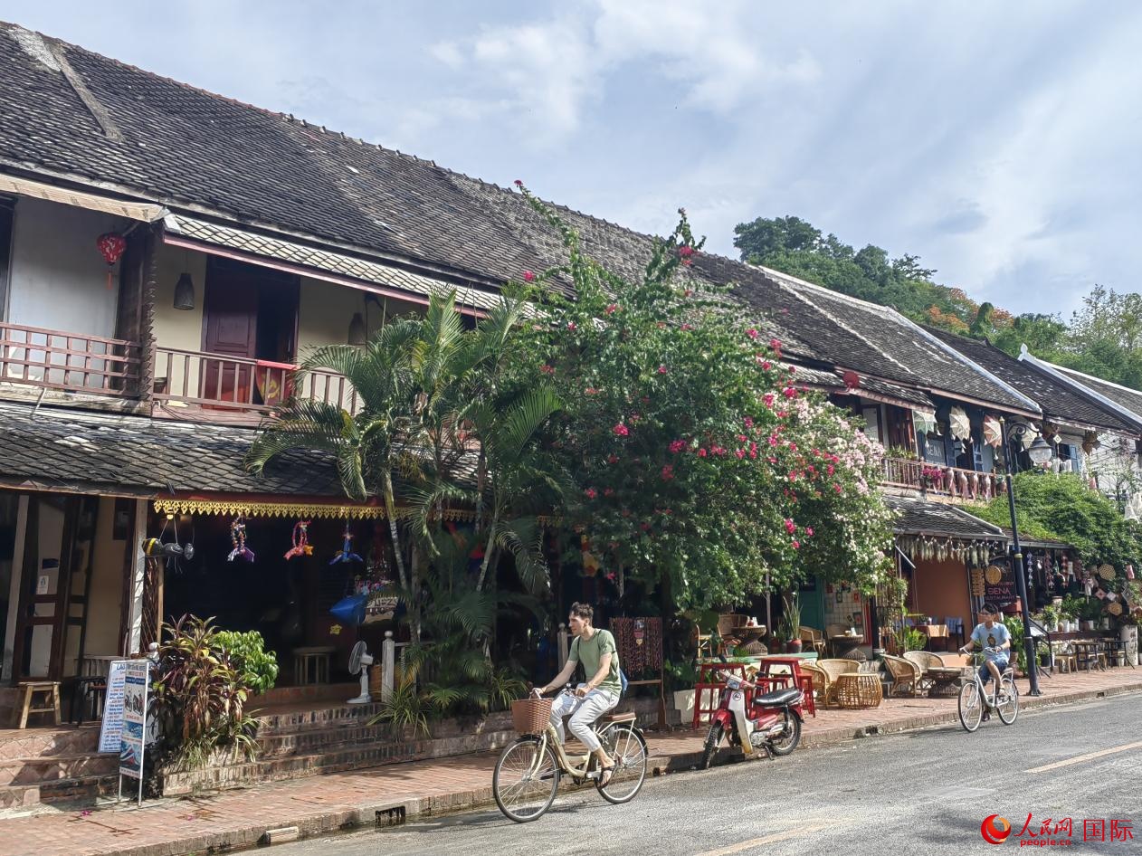 游客在瑯勃拉邦街道上騎行游覽。人民網(wǎng)記者 楊一攝