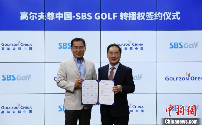 7月14日,“高爾夫尊中國公開賽”賽事轉(zhuǎn)播權(quán)簽約儀式在首爾舉行。圖為韓國SBS GOLF代表李尚根(左)和高爾夫尊中國會(huì)長樸英祚(右)在簽約儀式。高爾夫尊中國 供圖