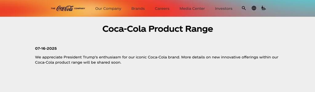 可口可樂公司同日在其官網(wǎng)上發(fā)表聲明說,感謝特朗普總統(tǒng)對(duì)其標(biāo)志性可口可樂品牌的熱情?!瓣P(guān)于可口可樂產(chǎn)品系列創(chuàng)新產(chǎn)品的更多細(xì)節(jié)將很快公布”。