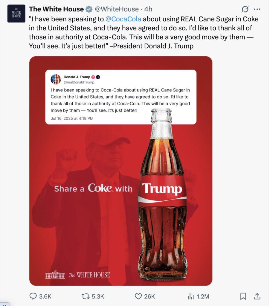 白宮社交媒體賬號(hào)轉(zhuǎn)發(fā)特朗普關(guān)于讓在美銷售可口可樂使用蔗糖帖文的截圖。