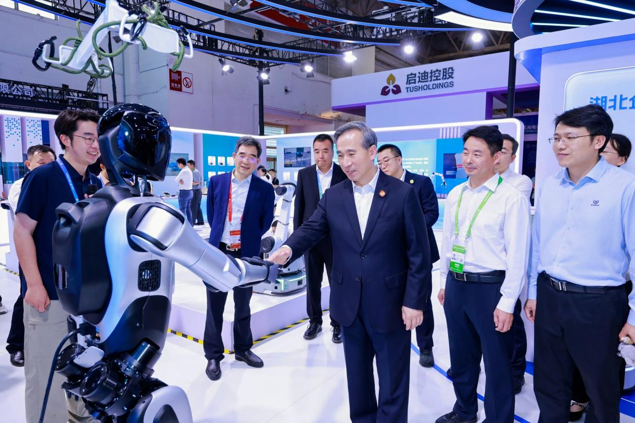 任鴻斌首先來(lái)到武漢格藍(lán)若公司展臺(tái),觀看“勞動(dòng)者”系列機(jī)器人演示,與機(jī)器人握手互動(dòng),仔細(xì)詢問(wèn)了機(jī)器人的負(fù)載能力與環(huán)境適應(yīng)性能。在武漢光谷華匯科技展臺(tái),他察看了“楚寶”系列機(jī)器人摔倒爬起等運(yùn)動(dòng)動(dòng)作,了解其在安防巡邏、應(yīng)急救援等場(chǎng)景的應(yīng)用情況。在“荊楚 1 號(hào)” 機(jī)器人展臺(tái),他聽(tīng)取了荊楚機(jī)器人的應(yīng)用場(chǎng)景和量產(chǎn)進(jìn)展介紹,對(duì)其獨(dú)特的全絲杠驅(qū)動(dòng)技術(shù)給予贊賞,強(qiáng)調(diào)要發(fā)揮院士團(tuán)隊(duì)引領(lǐng)作用,加快科研成果產(chǎn)業(yè)化落地。