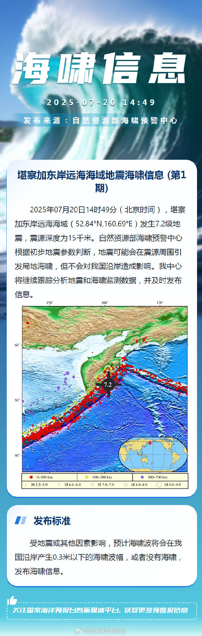 央視網(wǎng)消息:據(jù)國家海洋預(yù)報臺官方微博信息,2025年07月20日14時49分(北京時間),堪察加?xùn)|岸遠(yuǎn)海海域(52.84°N,160.69°E)發(fā)生7.2級地震,震源深度為15千米。自然資源部海嘯預(yù)警中心根據(jù)初步地震參數(shù)判斷,地震可能會在震源周圍引發(fā)局地海嘯,但不會對我國沿岸造成影響。中心將繼續(xù)跟蹤分析地震和海嘯監(jiān)測數(shù)據(jù),并及時發(fā)布信息。