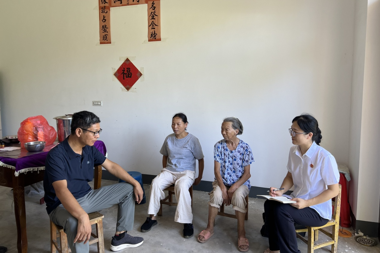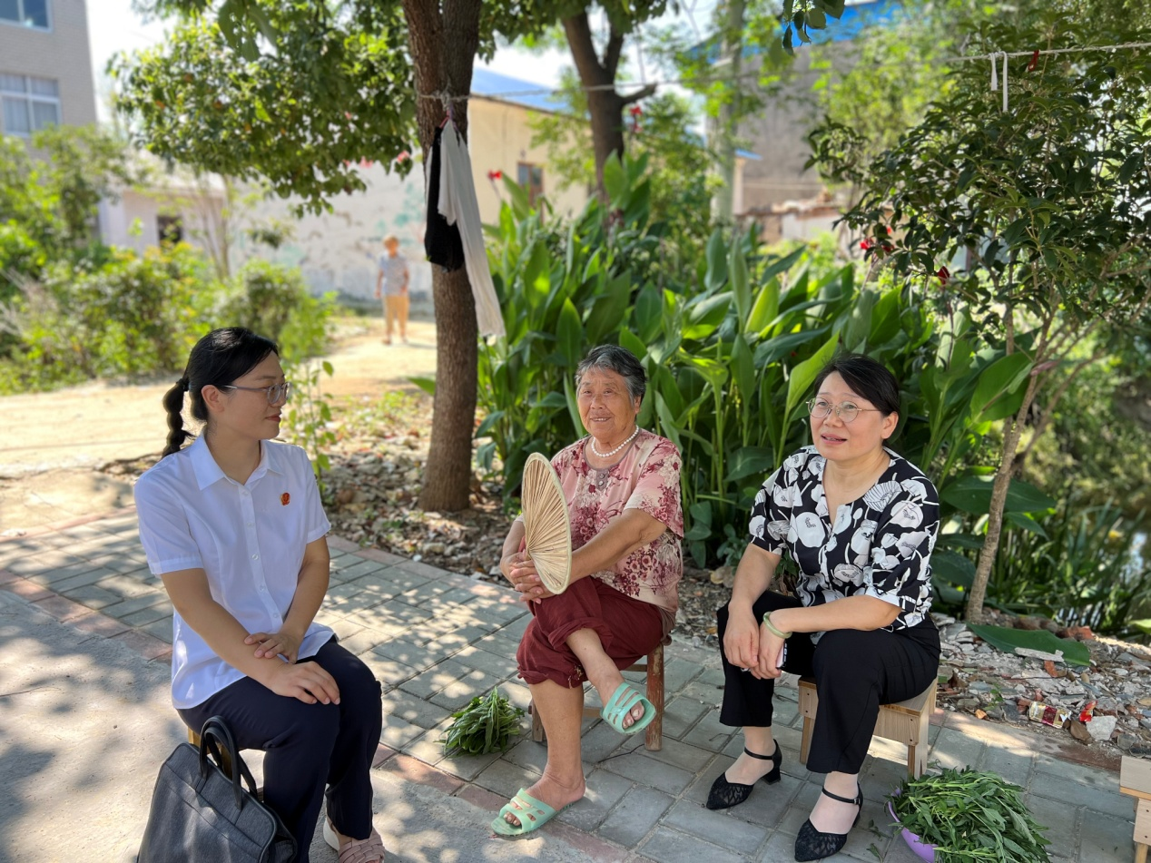 在村路邊的大樹底下,詹伍權(quán)主席與李舒庭長遇到一位乘涼的老奶奶,兩人主動上前噓寒問暖,詳細(xì)詢問老人的身體狀況、家庭生活及養(yǎng)老保障情況,叮囑老人注意夏季防暑,并結(jié)合老年人權(quán)益保障法,告知其在贍養(yǎng)、醫(yī)療等方面的合法權(quán)益及維權(quán)途徑。