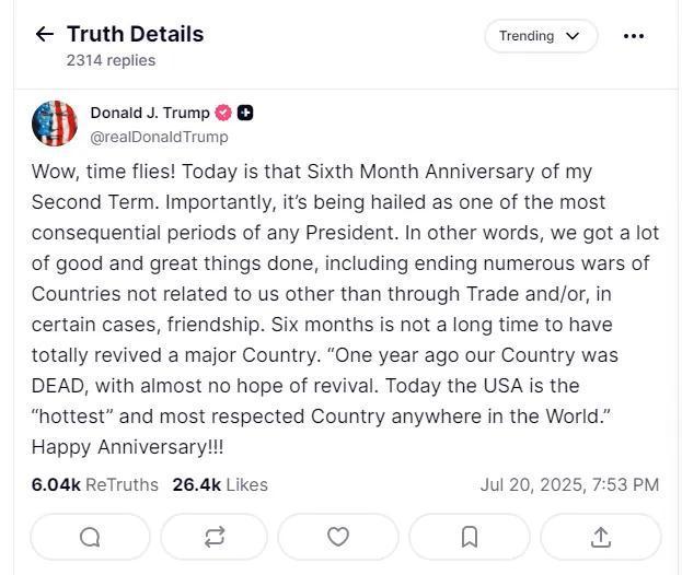 “哇,時(shí)間飛逝!今天是我第二個(gè)任期的半周年紀(jì)念日?!碧乩势諏懙?,“重要的是,這段時(shí)間被認(rèn)為是歷任總統(tǒng)任期內(nèi)最具影響力的時(shí)期之一。換句話說,我們做了很多好事和大事,結(jié)束了多場與我們無關(guān)的國家的戰(zhàn)爭……”