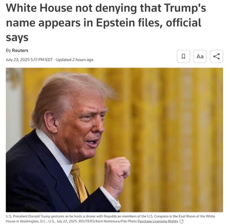 路透社報道,一名政府官員稱,白宮并未否認(rèn)特朗普總統(tǒng)的名字出現(xiàn)在愛潑斯坦案的相關(guān)文件中