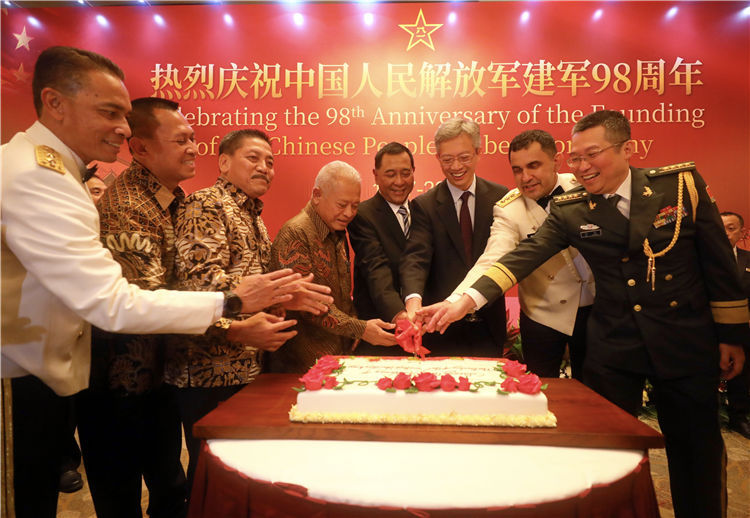 人民網(wǎng)雅加達(dá)7月24日電 (記者李培松、曹師韻)7月22日晚,中國(guó)駐印度尼西亞使館在雅加達(dá)舉行招待會(huì),熱烈慶祝中國(guó)人民解放軍建軍98周年,中國(guó)駐印尼大使王魯彤等使館以及中國(guó)駐東盟使團(tuán)外交官出席。印尼前國(guó)防部長(zhǎng)普爾諾莫、國(guó)防部監(jiān)察長(zhǎng)路易中將、國(guó)防大學(xué)校長(zhǎng)安頓、前海軍參謀長(zhǎng)馬塞提奧退役海軍上將等印尼軍政官員,各國(guó)駐印尼使節(jié)、武官,印尼工商界代表,駐印尼中資機(jī)構(gòu)代表,華僑華人代表等850余人參加。