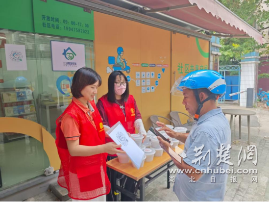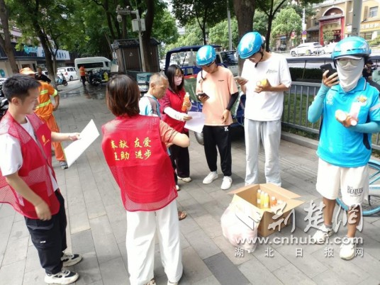 “師傅,喝瓶冰水,記得防暑啊?!被顒?dòng)現(xiàn)場(chǎng),紅馬甲志愿者將冰鎮(zhèn)礦泉水、藿香正氣液、降溫貼等防暑用品一一遞到外賣(mài)員、快遞小哥和環(huán)衛(wèi)工人手中。為了照顧騎手等餐時(shí)間短、流動(dòng)頻繁的特點(diǎn),社區(qū)提前將綠豆湯和糕點(diǎn)送至暖新驛站,實(shí)現(xiàn)“人找貨”變“貨找人”,當(dāng)天共為50多位戶外勞動(dòng)者送上了這份貼心清涼。