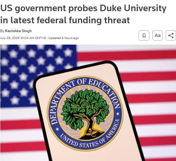 中新網(wǎng)7月29日電 據(jù)美國有線電視新聞網(wǎng)(CNN)及路透社報道,當(dāng)?shù)貢r間28日,美國特朗普政府表示,對美國杜克大學(xué)及《杜克法律雜志》展開調(diào)查,指控其存在偏向少數(shù)族裔群體的優(yōu)待行為,杜克大學(xué)由此成為最新一所可能被削減聯(lián)邦資金的美國高校。