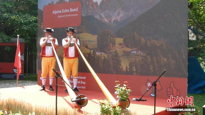 8月1日,演奏家在北京瑞士駐華大使館演奏瑞士傳統(tǒng)管樂器阿爾卑斯號(hào)角,慶祝瑞士國慶日。 趙婧姝 攝