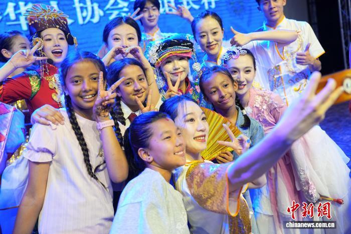8月3日,尼泊爾加德滿都,中尼建交70周年“多彩中華”文藝演出在尼泊爾軍官俱樂部上演。多名尼泊爾女孩在演出結(jié)束后,與西南民族大學石榴籽藝術(shù)團的表演者合影留念。中新社記者 崔楠 攝