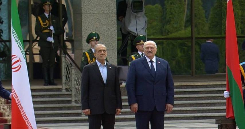 △伊朗總統(tǒng)佩澤希齊揚(左)和白俄羅斯總統(tǒng)盧卡申科(右)在歡迎儀式現(xiàn)場